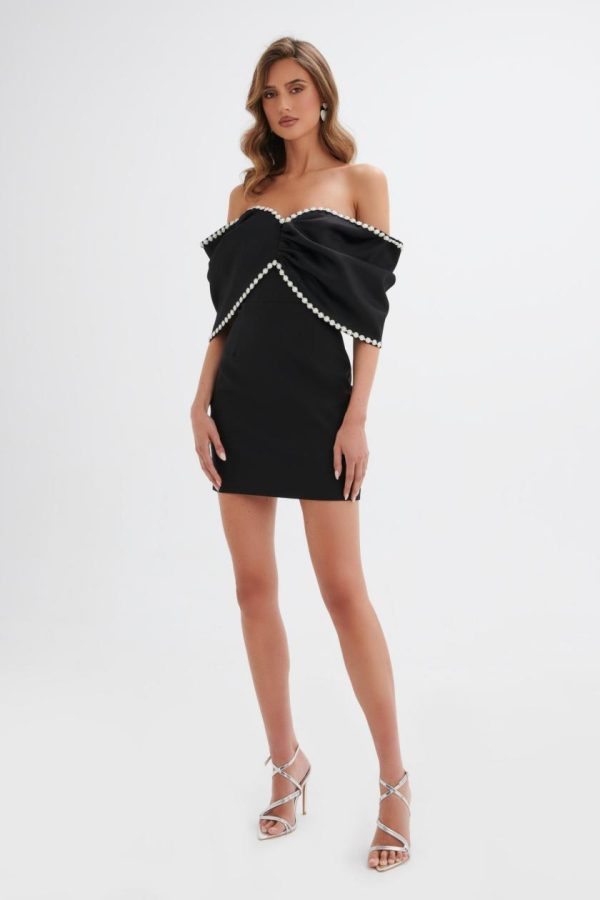 Make a stunning statement at your next special event with our showstopping Bardot Embellished Volume Sleeve Mini Dress in sophisticated black. Expertly constructed from premium black crepe and bonded satin, this dress features a flattering mini length and sweetheart neckline that creates a captivating silhouette. The dramatic bardot sleeves are accented with an elegant satin bow, while luxurious diamante trim delivers brilliant sparkle that catches the light beautifully.