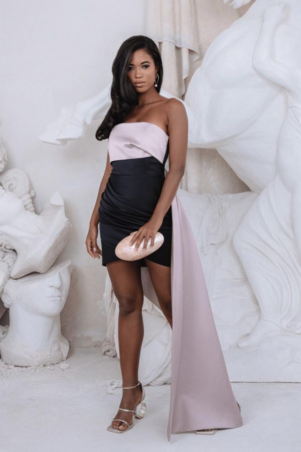 - Design Details: Close to the body fit mini dress with wrap skirt, contrast pleat panel & floor length drape.