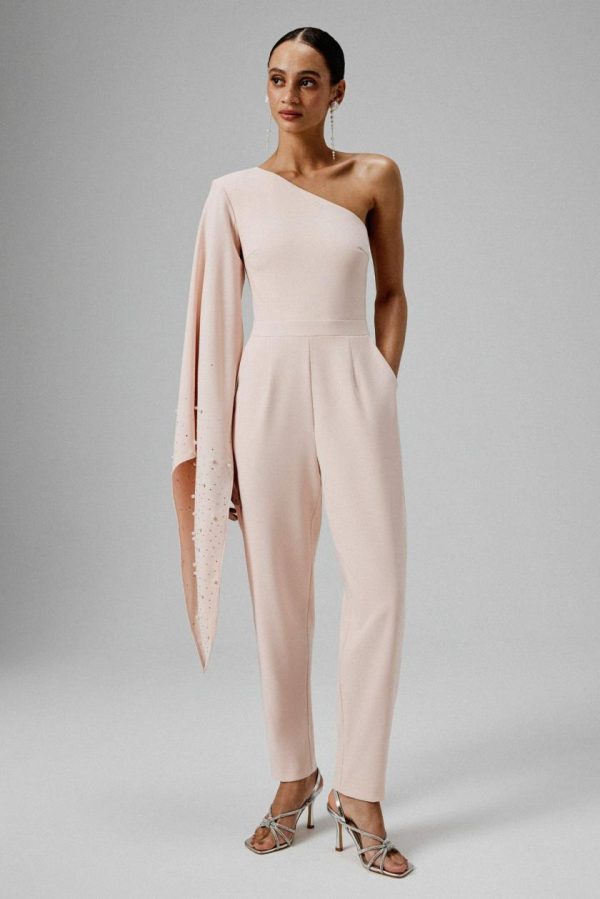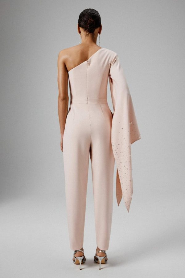 Make a stunning entrance with the KADY Ombre Embellished One-Shoulder Jumpsuit in Blush Pink, where contemporary design meets timeless elegance. This premium jumpsuit features luxurious crepe fabric with a fashion-forward one-shoulder neckline and a dramatic floor-length cape sleeve. The sleeve showcases exquisite diamante and pearl detailing arranged in a captivating ombre pattern that catches the light beautifully. The tailored tapered trousers create a streamlined silhouette that flatters your figure, offering a sophisticated look that commands attention. Ideal for galas, formal events, or special occasions, this statement piece delivers unmatched elegance and confidence.