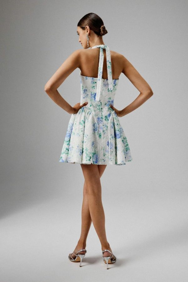 Command attention in our CARA Micro Button and Loop Detail Volume Flared Mini Dress, meticulously designed in exquisite floral broderie. The dress flows into a beautifully flared mini skirt with elegant gathered detailing, creating graceful movement with every step. The chic halter neck design features a deep V-neckline accentuated with delicate loop trim and self-fabric covered buttons for a polished finish. Ideal for summer weddings, garden parties, or destination events, this dress combines contemporary femininity with timeless elegance, ensuring you stand out on any special occasion.