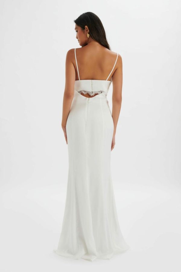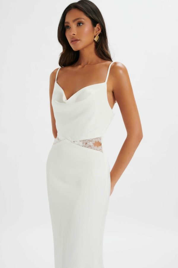 Experience the ultimate in sophistication with our stunning MAY Lace Insert Satin Maxi Dress in pristine white. This exquisite gown features a graceful cowl neckline and a beautifully contoured silhouette, enhanced with elegant lace trim cutouts that create a truly romantic aesthetic. Perfect for wedding celebrations, formal dinners, or as a standout evening ensemble, this dress delivers timeless elegance and exceptional craftsmanship.