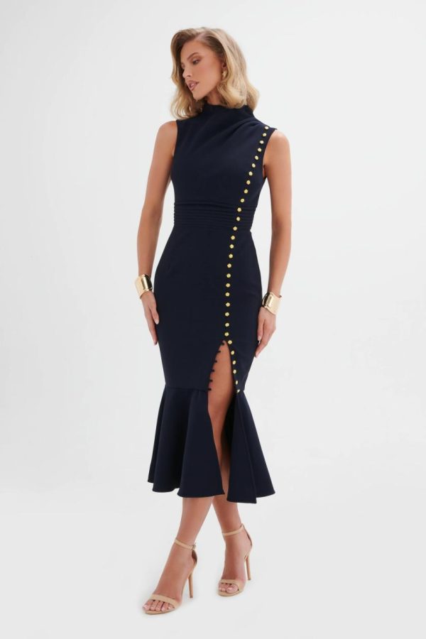 Make a stunning impression at your next special event with our SAFFRON High Neck Rose Button Midi Dress in sophisticated navy. The elegant pleated high neckline and body-skimming fit create a beautifully flattering silhouette, while the graceful flounced hem and subtle thigh split add movement and modern elegance. Featuring exquisite gold rose-shaped button accents, this timeless fit-and-flare design offers exceptional versatility for weddings, formal gatherings, and any occasion where you want to look your absolute best.