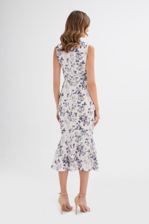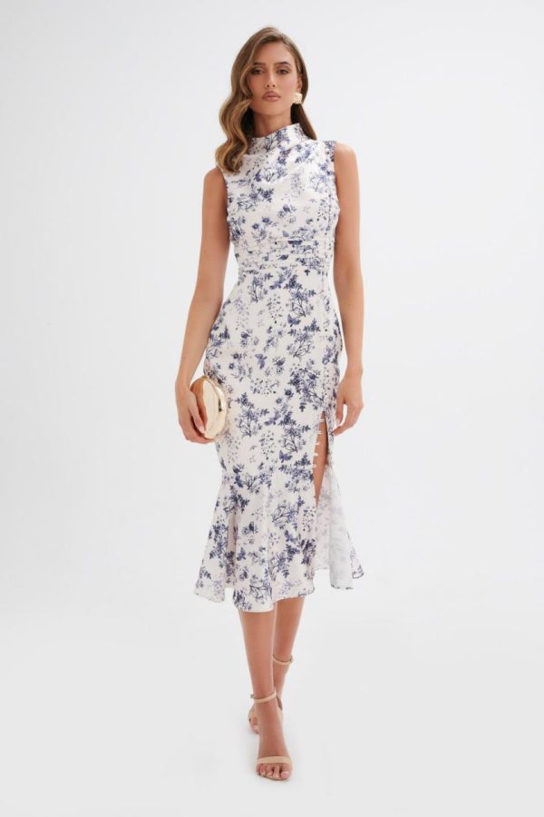 Meet our most popular SAFFRON High Neck Satin Midi Dress, now available in a stunning navy porcelain print. Made from premium satin fabric, this sophisticated dress showcases an elegant high neckline with beautiful micro button accents that add refined detail. Designed with a figure-flattering silhouette, graceful neckline pleats, a stylish thigh split, and a classic fit-and-flare shape, it’s ideal for weddings and special events. Add this versatile piece to your collection for effortless elegance.
