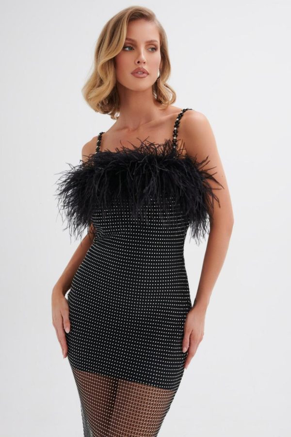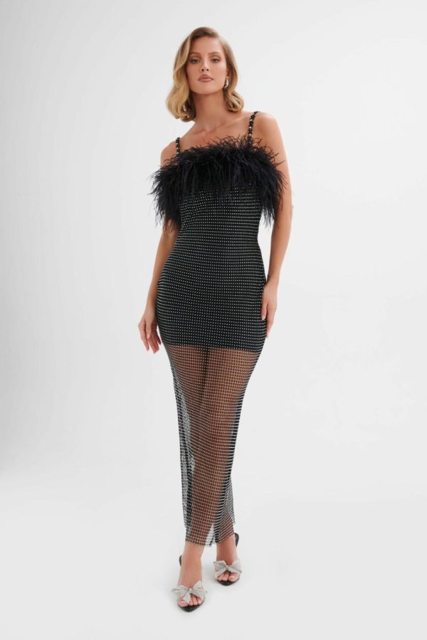 Elevate your evening wardrobe with the NOVA Rhinestone Embellished Feather Maxi Dress in sophisticated black. Expertly constructed from premium black crepe fabric featuring a dazzling crystal-embellished overlay, this statement-making dress pairs a graceful maxi length with a form-fitting mini underlayer. Delicate black pearl-embellished straps deliver refined elegance, while the opulent feather-trimmed Bardot neckline creates undeniable glamour. Engineered to capture the light and turn heads, this dress ensures a radiant, eye-catching silhouette for your most memorable nights out.