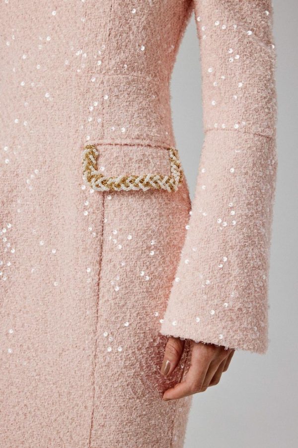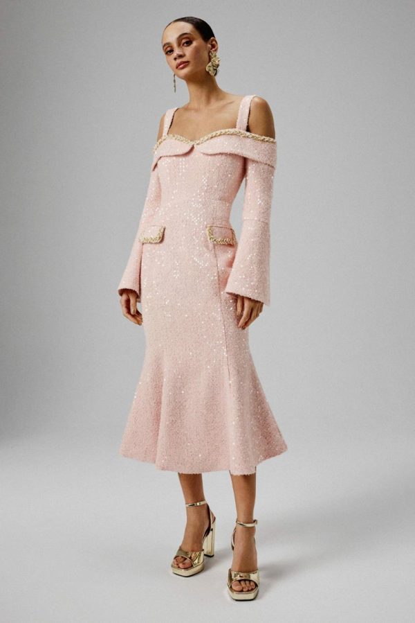 Meet our stunning MANDI Sequin Boucle Long Midi Dress in radiant pink. This showstopping dress creates a sculpted silhouette that elegantly contours your curves, flowing into a graceful longline midi cut with a fitted fishtail skirt for dramatic impact. The pleated bardot neckline features exquisite embellished detailing, while the perfectly tailored sleeves and beautifully finished fluted hem add sophisticated feminine charm. Designed in premium sequin boucle fabric, this elegant dress is your ultimate choice for wedding events, formal gatherings, and spring celebrations.