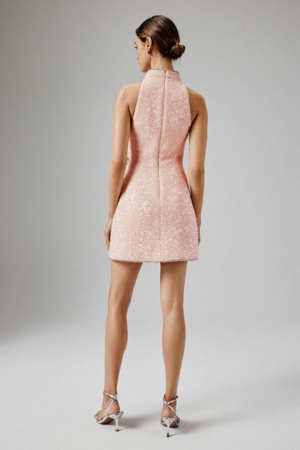 Step into the spotlight with the SOLENE Sequin Boucle High Collar Mini Dress, featuring premium pink sequin bouclé fabric that creates a stunning shimmer effect with movement. The sophisticated high neckline with chic front keyhole detail offers modern elegance, while the statement bow embellishment at the neck and crystal-adorned bow at the side slit deliver eye-catching glamour. Finished with elegant trim detailing along the neckline and slit plus a flattering tulip skirt design, this mini dress combines feminine charm with contemporary sophistication. Ideal for special evenings, celebrations, or any occasion where you want to make a memorable impression, the SOLENE dress ensures you’ll look and feel absolutely radiant.