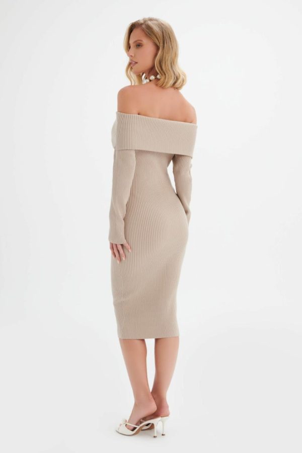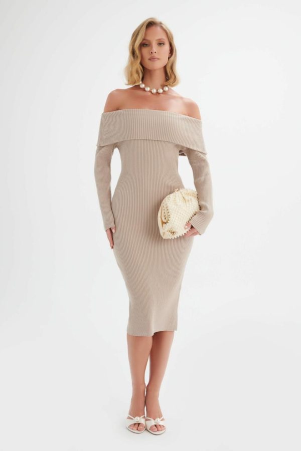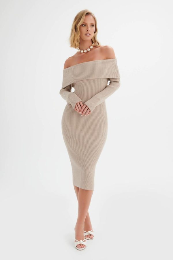 Discover the SUNDAY Wool Blend Midi Dress, crafted with premium attention to detail. This elegant dress features a beautifully ribbed knitted construction that delivers exceptional comfort and style. The sophisticated fold Bardot neckline and off-shoulder design create a stunning silhouette that transitions effortlessly from daytime chic to evening elegance.