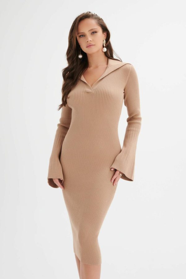 Lavish Alice Women’s Camel Ribbed Knit Midi Dress