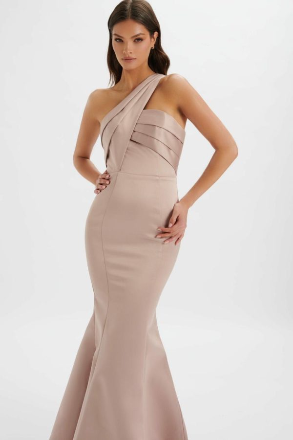 Experience sophisticated elegance with our SHAILENE Bonded Satin Asymmetric Maxi Dress in Mink. Designed with premium luxe satin, this dress creates a stunning silhouette that contours your figure before sweeping into a graceful fishtail skirt. The modern asymmetric neckline delivers a captivating look that completes the refined feminine appeal. Perfect for special occasions, style with loose waves and subtle glam makeup for a complete luxurious ensemble.