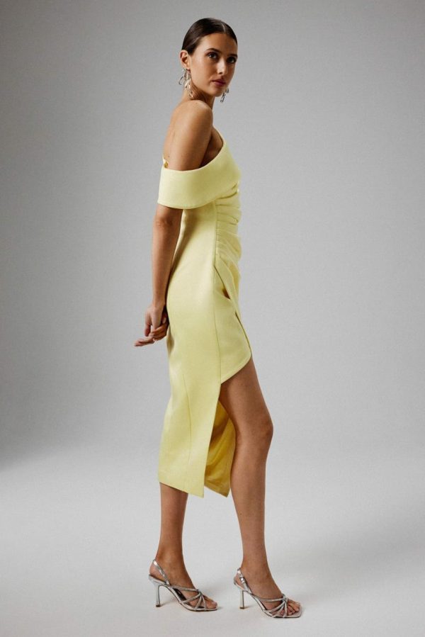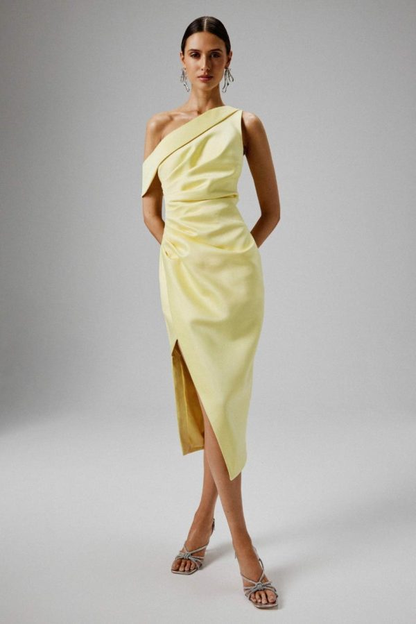 Command attention this season with our coveted BAMBI dress, now available in a vibrant seasonal yellow hue. Expertly tailored from structured bonded satin, this sophisticated dress contours your silhouette with a form-flattering fit that elegantly highlights your natural shape. The striking asymmetric hemline, featuring a dramatic high split, creates captivating movement, while the artful pleating delivers refined texture and dimension. Designed with a fashionable one-shoulder neckline, this dress masterfully blends timeless elegance with contemporary appeal, making it the perfect choice for wedding guest occasions, special events, and formal gatherings.
