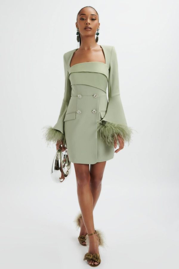 Experience exceptional tailoring with our premium crepe fabric in a sophisticated sage green hue. Dramatic feather fluted sleeves and sparkling diamante buttons create an eye-catching luxury statement, while the contrast bonded satin bust wrap delivers contemporary elegance. This versatile piece effortlessly transitions from office to evening wear.