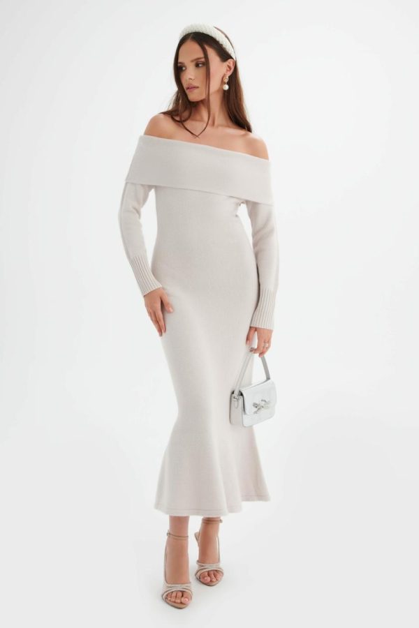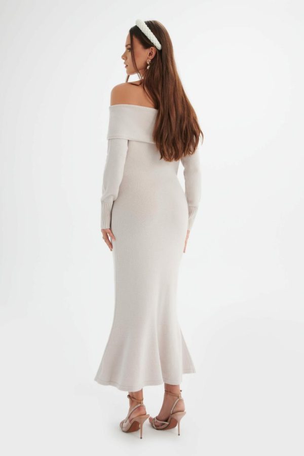 Expertly crafted with a premium wool blend enhanced with cashmere, our CLOVER dress delivers exceptional softness and luxurious comfort. The elegant folded Bardot neckline and form-fitting sleeves with textured ribbed cuffs create a sophisticated off-shoulder silhouette, while the graceful fit-and-flare fishtail hem adds timeless elegance. Perfect for both casual outings and special occasions, this midi dress combines effortless style with everyday versatility.