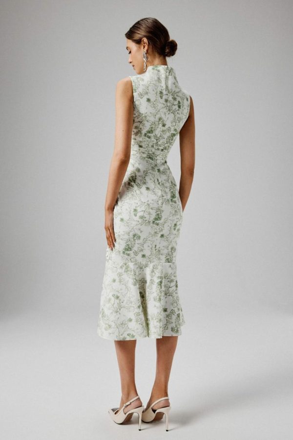 Meet our coveted SAFFRON High Neck Crepe Midi Dress featuring an exquisite sage porcelain print. This sophisticated piece showcases premium crepe fabric in a stunning botanical-inspired pattern, with a graceful high neck design and a figure-flattering silhouette that enhances your natural curves. The elegant flounced hem and delicate pleat detailing at the neckline create timeless appeal, while the subtle thigh split and refined self-fabric buttons add sophisticated charm. Step into spring with this chic midi dress, ideal for wedding celebrations, special events, or any occasion where you want to stand out with effortless elegance.